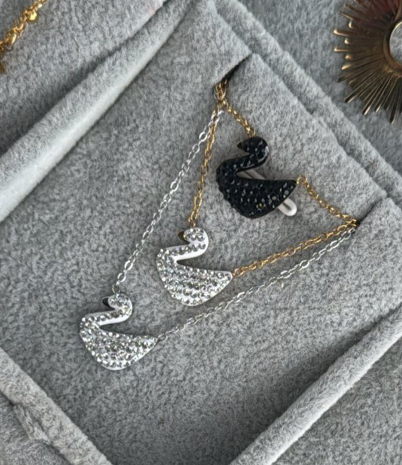 Colgante de cisne en acero inoxidable — Disponible en tres combinaciones elegantes: blanco-dorado, negro-dorado y negro-plateado. Cada pieza mantiene su brillo y color con el tiempo, resistente al agua y al desgaste. Perfecto para añadir un toque sofisticado a cualquier look. Precio: 5 € cada uno