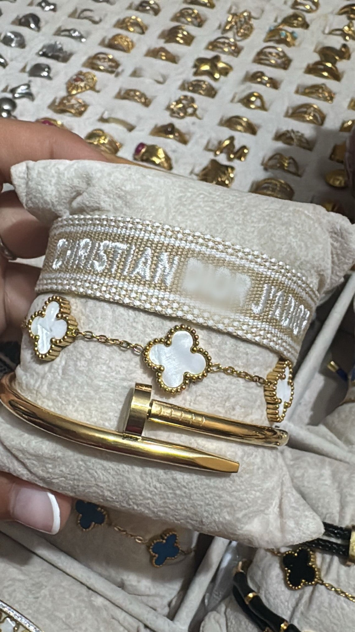 Pack de 3 pulseras de acero — Un set versátil y moderno con tres diseños únicos: una pulsera con forma de clavo, una delicada pulsera de trébol blanca y una pulsera de cuerda. Fabricadas en acero de alta calidad que mantiene su brillo y color, ideales para combinar entre sà o llevar por separado, aportando estilo tanto a looks casuales como elegantes.