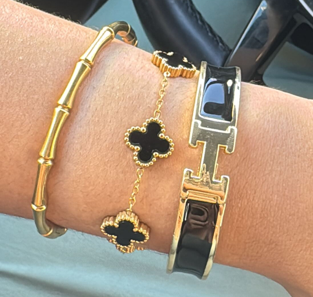 Pack de 3 pulseras en acero inoxidable — Un conjunto moderno y llamativo que incluye una pulsera máxima gruesa con detalle “H”, una pulsera de trébol negro y una pulsera estilo bambú dorado. Todas elaboradas en acero inoxidable de alta calidad, resistentes al agua y al desgaste, manteniendo su brillo y color. Perfectas para combinar entre sí o lucir por separado, añadiendo un toque sofisticado y elegante a cualquier look ✨🖤💛.